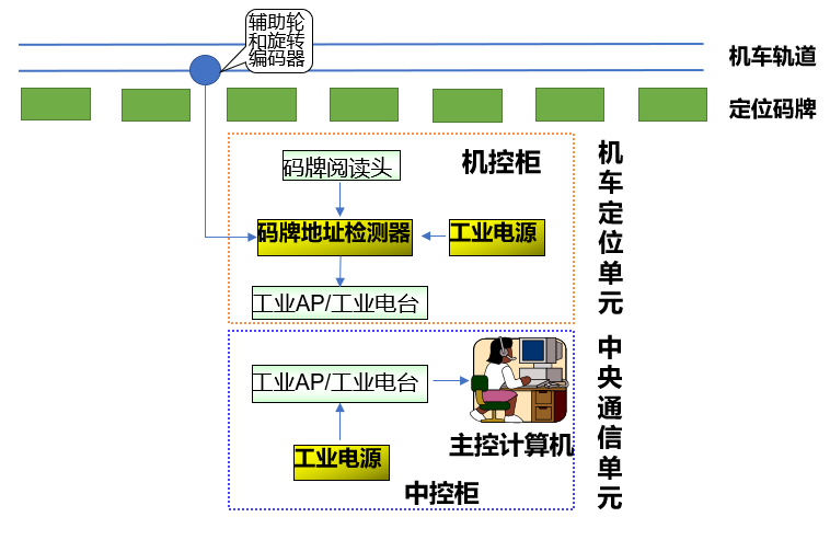 2、機(jī)車定位單元:工業(yè)電源,碼牌閱讀頭,輔助輪,絕對(duì)值旋轉(zhuǎn)編碼器,碼牌地址檢測器,工業(yè)數(shù)傳電臺(tái)或工業(yè)AP。