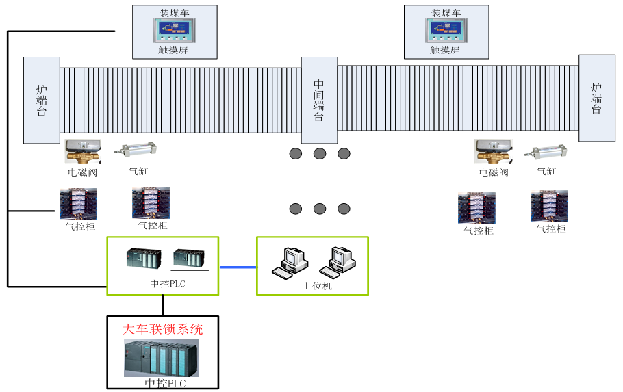 對(duì)上升管、內(nèi)翻板和高低壓氨水的相關(guān)動(dòng)作和時(shí)間進(jìn)行記錄,并對(duì)某一動(dòng)作時(shí)間和動(dòng)作間間隔等進(jìn)行統(tǒng)計(jì)??筛鶕?jù)操作方式、操作內(nèi)容和時(shí)間等進(jìn)行查詢。整個(gè)包括現(xiàn)場(chǎng)機(jī)械部分、現(xiàn)場(chǎng) 氣控柜部分、中控室部分、車載部 分和系統(tǒng)網(wǎng)絡(luò)。其中,現(xiàn)場(chǎng)部分是 系統(tǒng)的基礎(chǔ)硬件部分,其他三部分 為控制部分?,F(xiàn)場(chǎng)部分包含上升管蓋、內(nèi)翻板和高低壓氨水實(shí)現(xiàn)自動(dòng)控制所包含的氣缸、電磁閥及相關(guān)連接件。其他電氣和控制部分主要包含氣動(dòng)閥組、PLC模塊和上位機(jī)等,分別用于對(duì)現(xiàn)場(chǎng)設(shè)備狀態(tài)采集和控制指令輸出、系統(tǒng)的控制邏輯判斷和指令下發(fā)和數(shù)據(jù)存儲(chǔ)、展示以及人機(jī)交互操作。